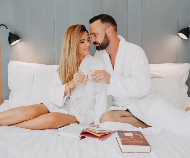 Pakiet powitalny w postaci butelki wina i czekoladek